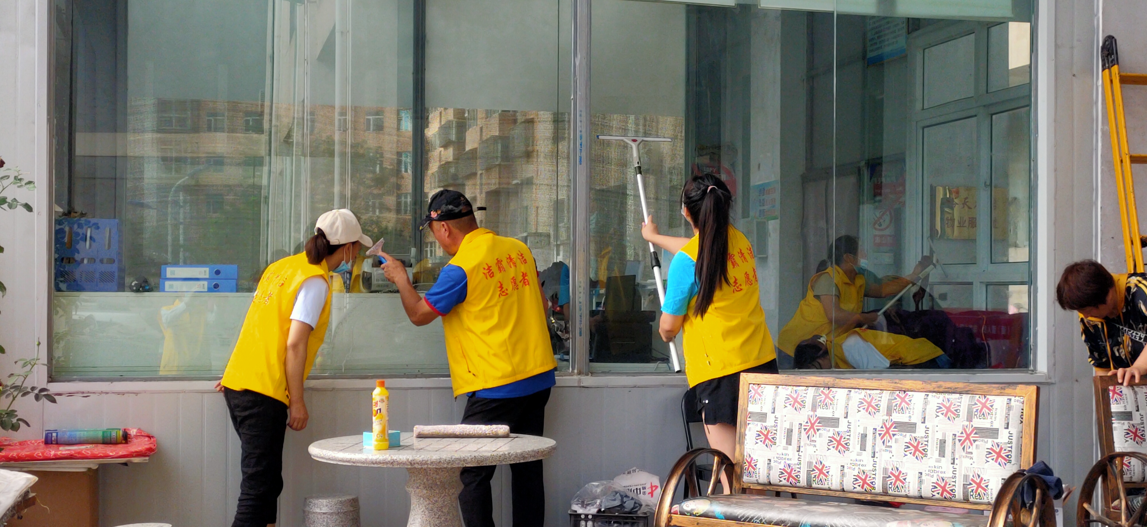 活動(dòng)現(xiàn)場,志愿者身穿黃色馬甲,自帶玻璃擦、毛巾、笤帚、簸箕等清潔工具,對(duì)小區(qū)物業(yè)服務(wù)處及小區(qū)環(huán)境進(jìn)行清潔打掃。他們有的清掃小區(qū)天臺(tái)上的垃圾;有的清理樓道門及公共設(shè)施上的牛皮癬;有的擦拭門衛(wèi)的玻璃;有的清洗紗窗;有的清洗物業(yè)服務(wù)處的玻璃幕墻……志愿者個(gè)個(gè)干勁十足,不怕臟、不怕累,經(jīng)過一個(gè)多小時(shí)的團(tuán)結(jié)協(xié)作,小區(qū)環(huán)境煥然一新。