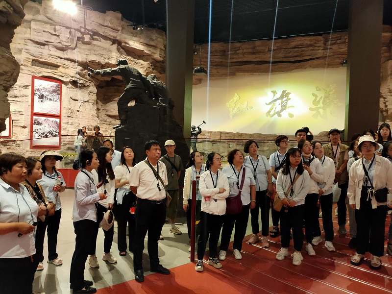 走進紅旗渠紀念館,大家跟隨講解員的腳步,在千年旱魔,世代抗爭;紅旗引領,創(chuàng)造奇跡;英雄人民,太行豐碑;山河巨變,實現(xiàn)夢想;繼往開來,精神永恒五個部分逐一駐足學習,通過一件件珍貴的物品,一幅幅生動的圖片、一幀幀震撼的畫面、一個個感人的故事,讓大家身臨其境感受到林州人民建造人工天河時不畏艱險,頑強拼搏,緊靠一錘一鏟削平1250座山頭、鑿通211個隧道、架設151個渡槽的恢弘場景。在場的各位都深深地被“自力更生、艱苦創(chuàng)業(yè)、團結協(xié)作、無私奉獻”的紅旗渠精神所感動,切實感受到中華民族勤勞堅韌的優(yōu)良傳統(tǒng),領悟社會主義是干出來的,新時代是奮斗出來的。