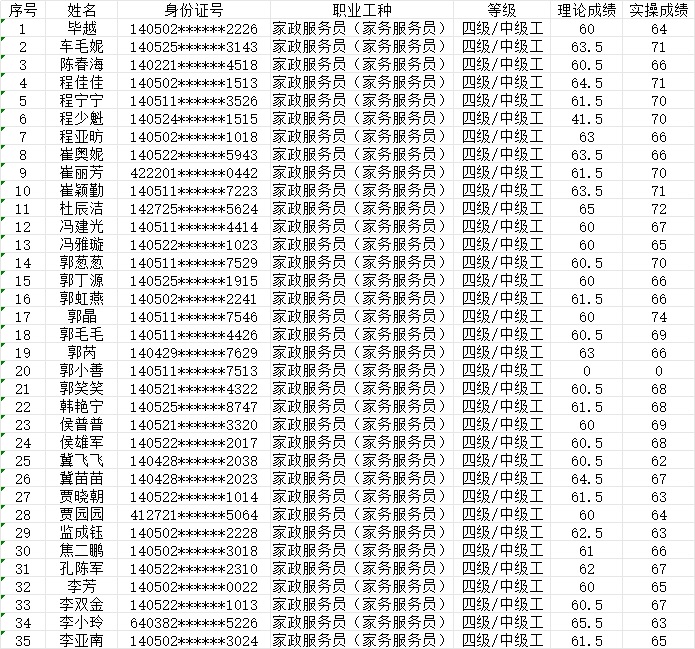2024年1月14日第1批家政服務(wù)員中級(jí)認(rèn)定人員成績(jī)公示