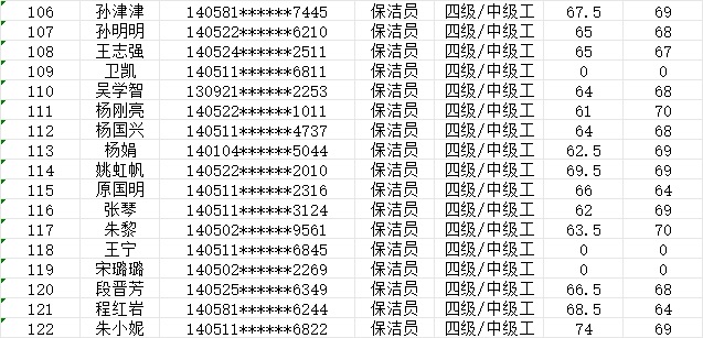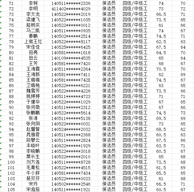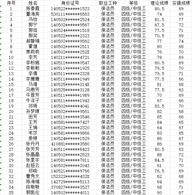 晉城市潔霸清潔服務(wù)股份有限公司職業(yè)技能等級(jí)認(rèn)定中心現(xiàn)將2024年1月20日認(rèn)定人員成績公示如下: