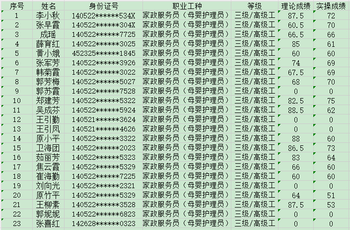 2024年5月20日上午第13批家政服務(wù)員高級(jí)認(rèn)定人員成績(jī)公示