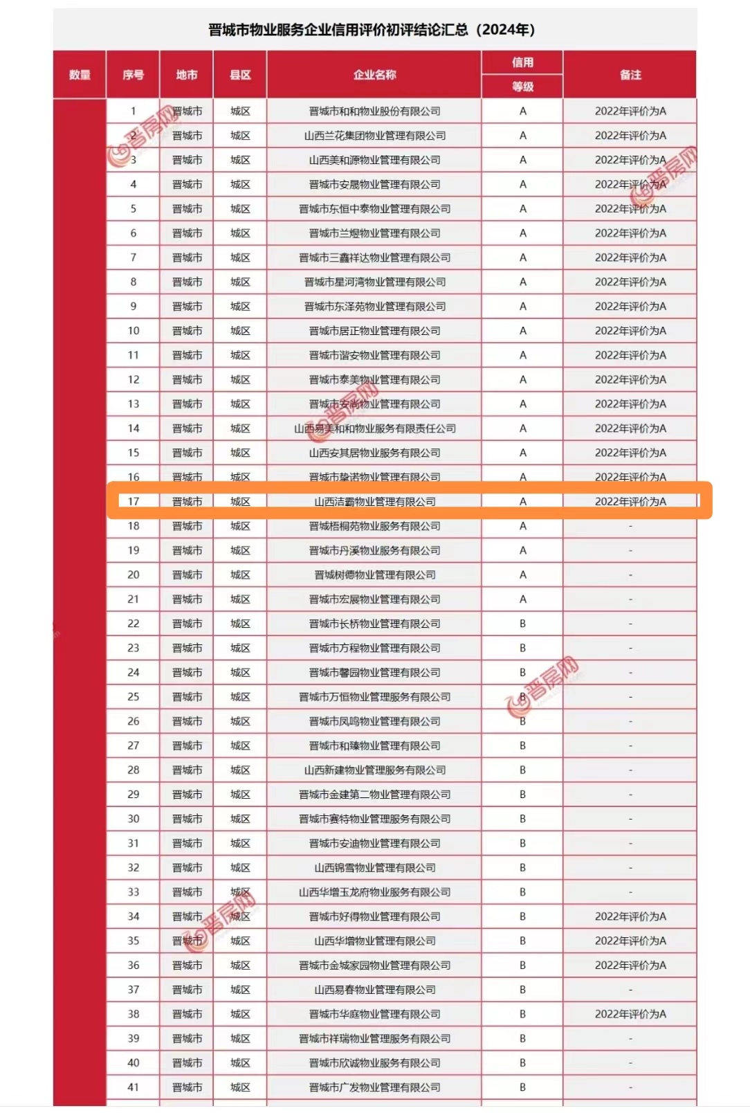 | 潔霸物業(yè)獲得2023年度物業(yè)服務(wù)企業(yè)信用等級(jí)A級(jí)認(rèn)證 |